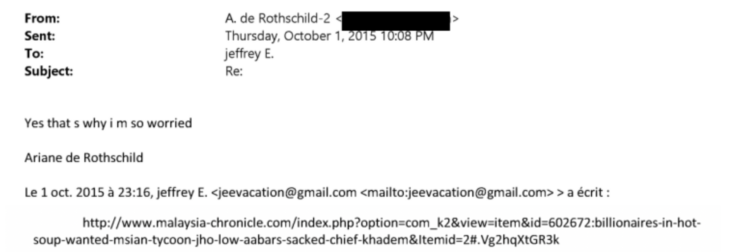 The following day, presumably after their call had filled him in on the story, Epstein sent Ariane sent another email attaching a link to an article reproducing the details of the story written by Sarawak Report entitled “Billionaires in hot soup: wanted Malaysian tycoon Jho Low, Aabar’s sacked chief Khadem”.