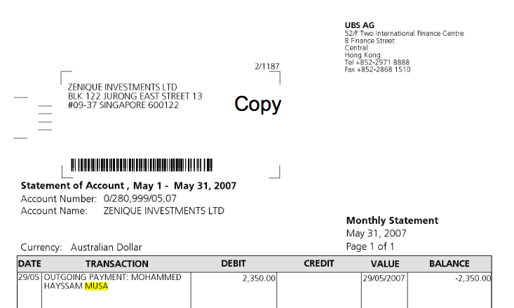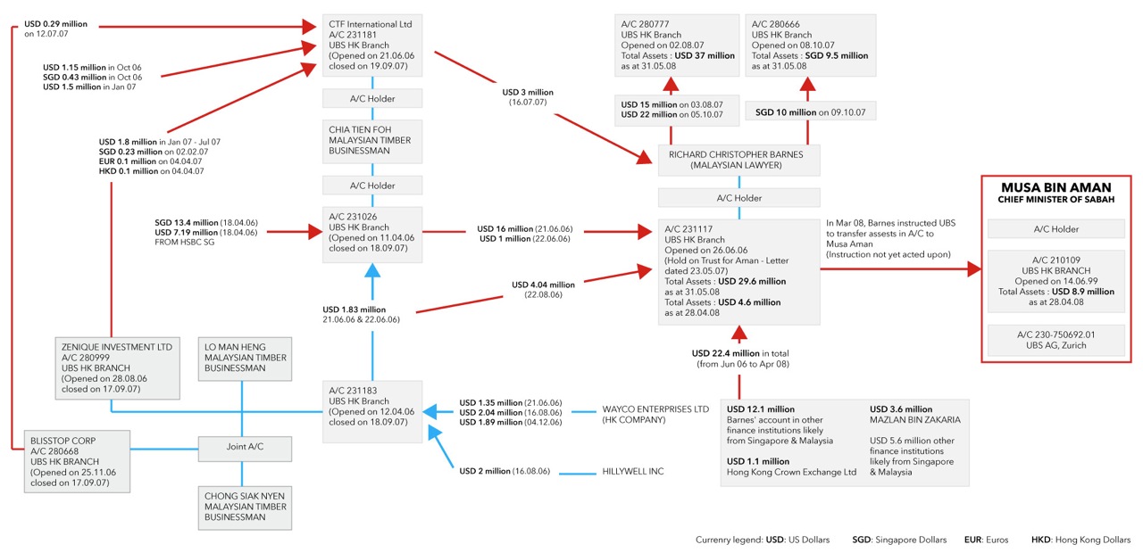 Web of bank accounts that link up to Musa’s personal UBS account in Zurich. Information from Hong Kong’s investigation after their arrest of Musa’s nominee, Michael Chia in 2008 carrying $16million in his bag.