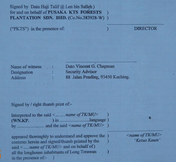 The above document is part of a draft copy of the one that was eventually signed by Len Talif Salleh and the Headman In 2009. Local people were outraged to discover the deal that had taken place without consultation and behind their backs.