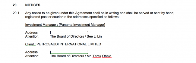 Li Lin Seet was also the signatory of the company Panama Investment Manager, which did a deal with PetroSaudi ‘front man’ Tarek Obaid to manage the funds of the PetroSaudi ‘subsidiary’ in the Seychelles.