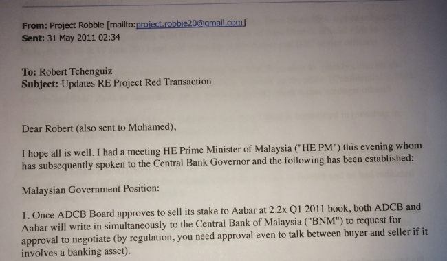 “It is important to put pressure on ADCB Board to ensure they agree on our price and that they only write to BNM for approval to negotiate with Aabar and not the other bidders”….