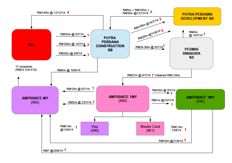 Much of this money travelled via a third account number ending 898 and it can be seen that a separate payment of RM6 million was also paid into the account directly from a separate subsidiary of PPB named Putrajaya Perdana Construction.