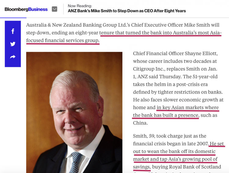 There are several senior figures, earning top dollar at ANZ Bank, who had to have known about the massive, game-changing accounts belonging to Najib Razak in their bank. These include ex-CEO Mike Smith, who resigned in September last year. According to his written accolades he had built business at the bank by focusing on none other than its South East Asian accounts, which purportedly did extremely well: