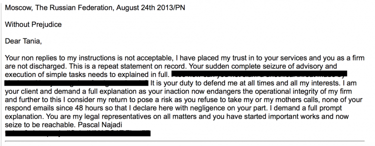 Pascal said that he agreed to the suggestion, based on his acquaintance with Scivetti. For some days Scivetti managed Najadi’s affairs and had total control of all access to his office and his papers. Then, she ceased answering calls and terminated her services. This was one email from Pascal, to which she did not reply: