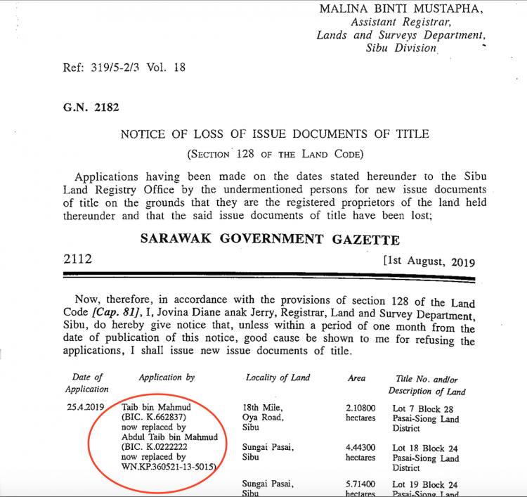 The notice in the latest August edition of the Sarawak Government Gazette details how Taib requested the re-issuing of the land titles back in April, because the originals had apparently become lost.