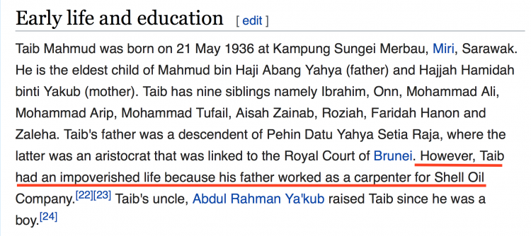 This was all changed in the 2014 biography where Taib was quoted saying in fact his family was not poor, but were well-off given they worked for Shell!
